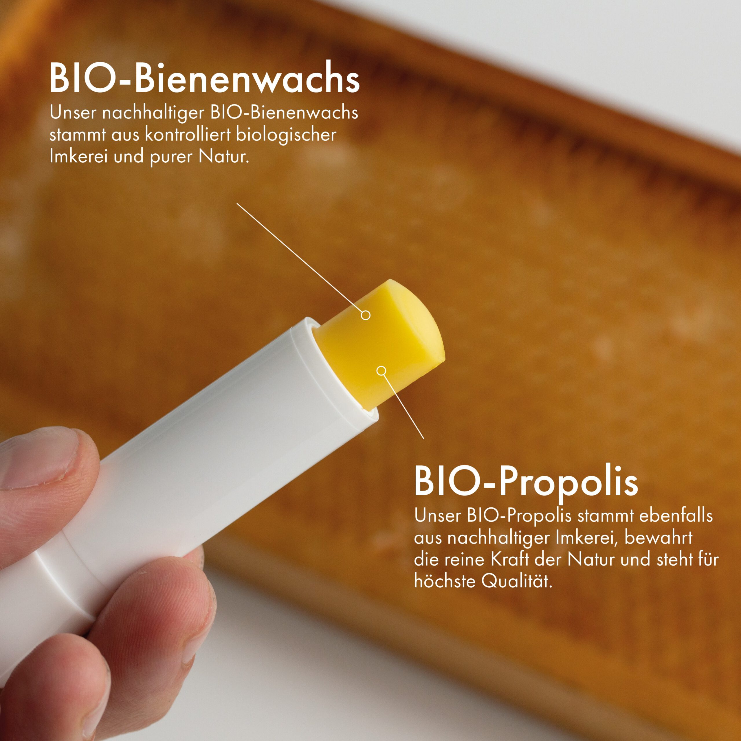 Unser Original Propolis Lippenbalsam Stift mit seinem UVA/UVB-Lichtschutz ist wunderbar für die tägliche Lippenpflge geeignet. Zudem kann er gut unter farbigen Lippenstiften getragen werden.